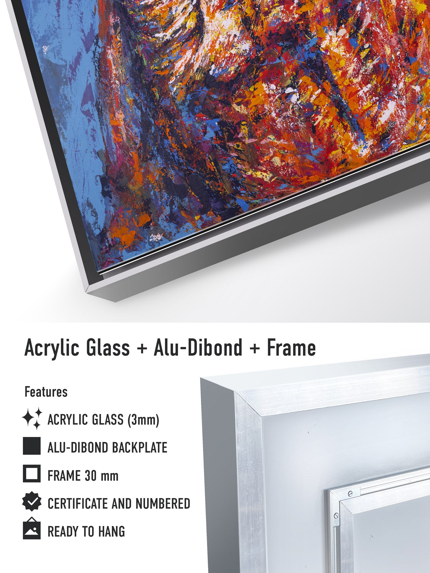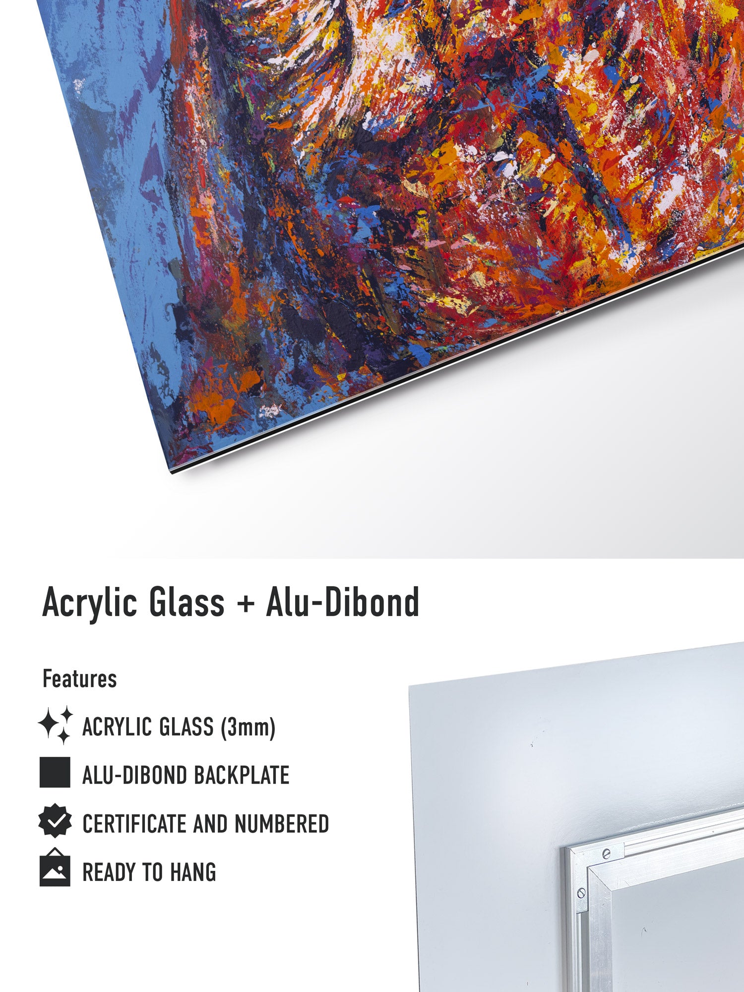 Der Acrylglas-Aufbau verleiht dem Kunstwerk eine beeindruckende Brillanz und Tiefenwirkung. In Verbindung mit dem stabilen 3 mm Alu-Dibond-Trägermaterial entsteht ein außergewöhnlich hochwertiges, langlebiges Kunstobjekt in Galeriequalität.