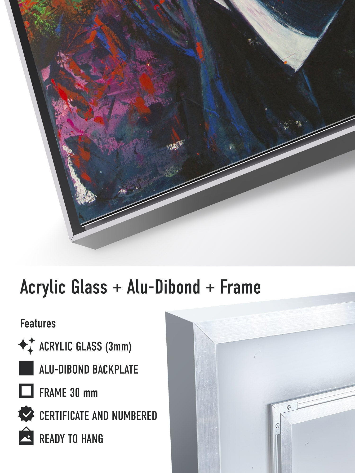Ein besonderes Highlight ist der satinierte Aluminium-Schattenfugenrahmen (30 mm): Durch den feinen Abstand zwischen Werk und Rahmen entsteht der Eindruck, als würde das Bild frei im Raum schweben – ein moderner Galerieeffekt, der das Kunstwerk optisch hervorhebt und seine Wirkung verstärkt.
