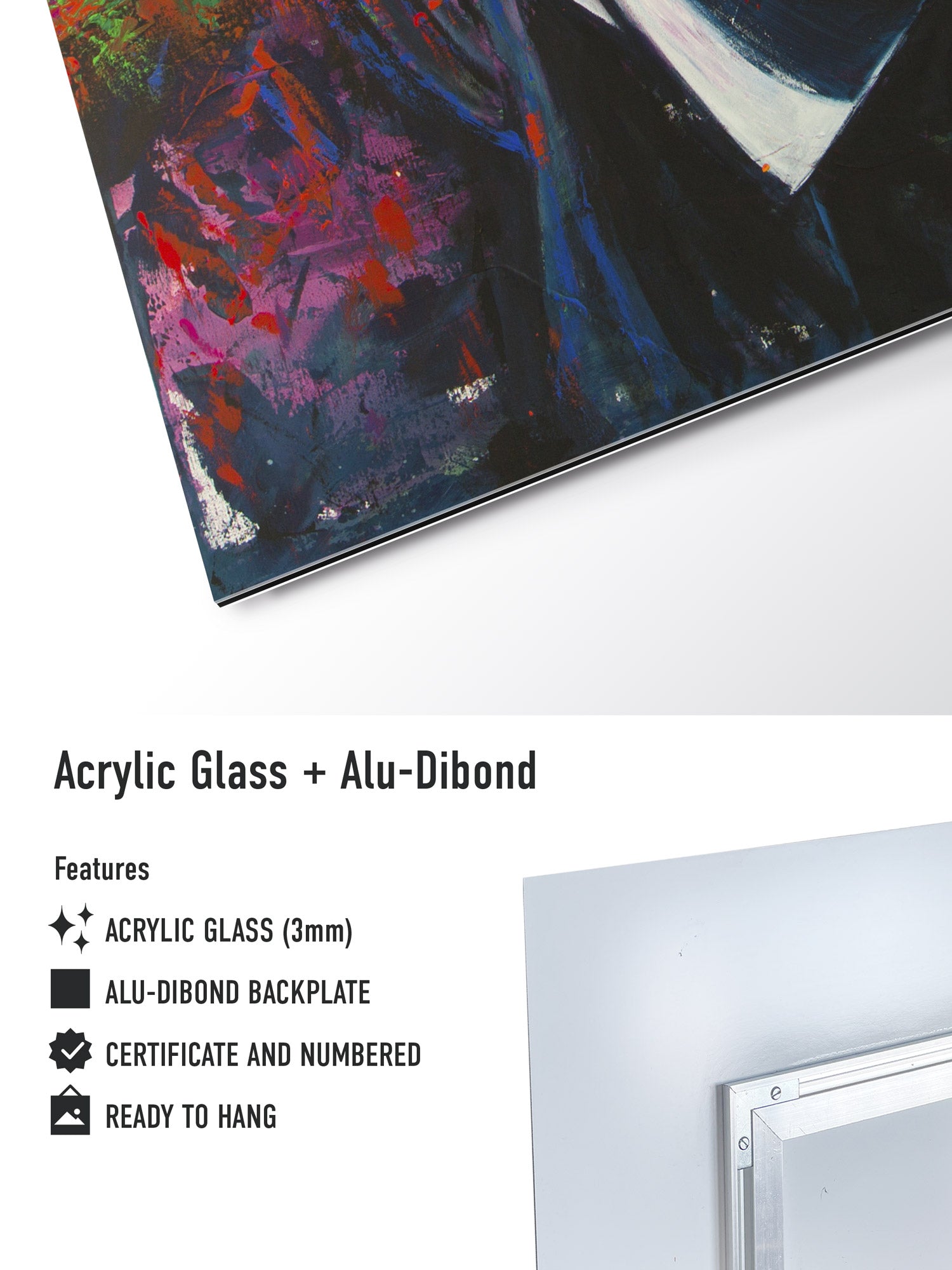 Der Acrylglas-Aufbau verleiht dem Kunstwerk eine beeindruckende Brillanz und Tiefenwirkung. In Verbindung mit dem stabilen 3 mm Alu-Dibond-Trägermaterial entsteht ein außergewöhnlich hochwertiges, langlebiges Kunstobjekt in Galeriequalität.