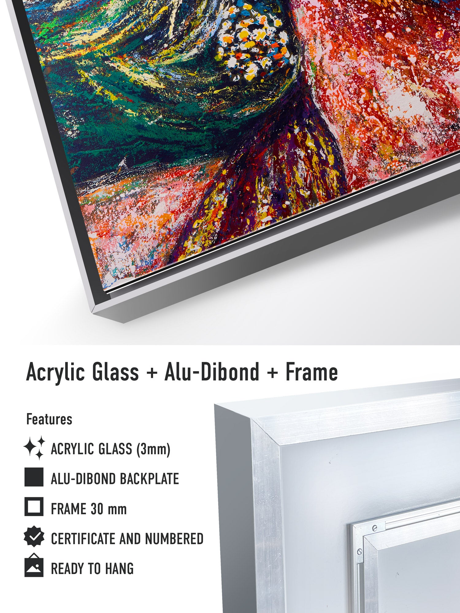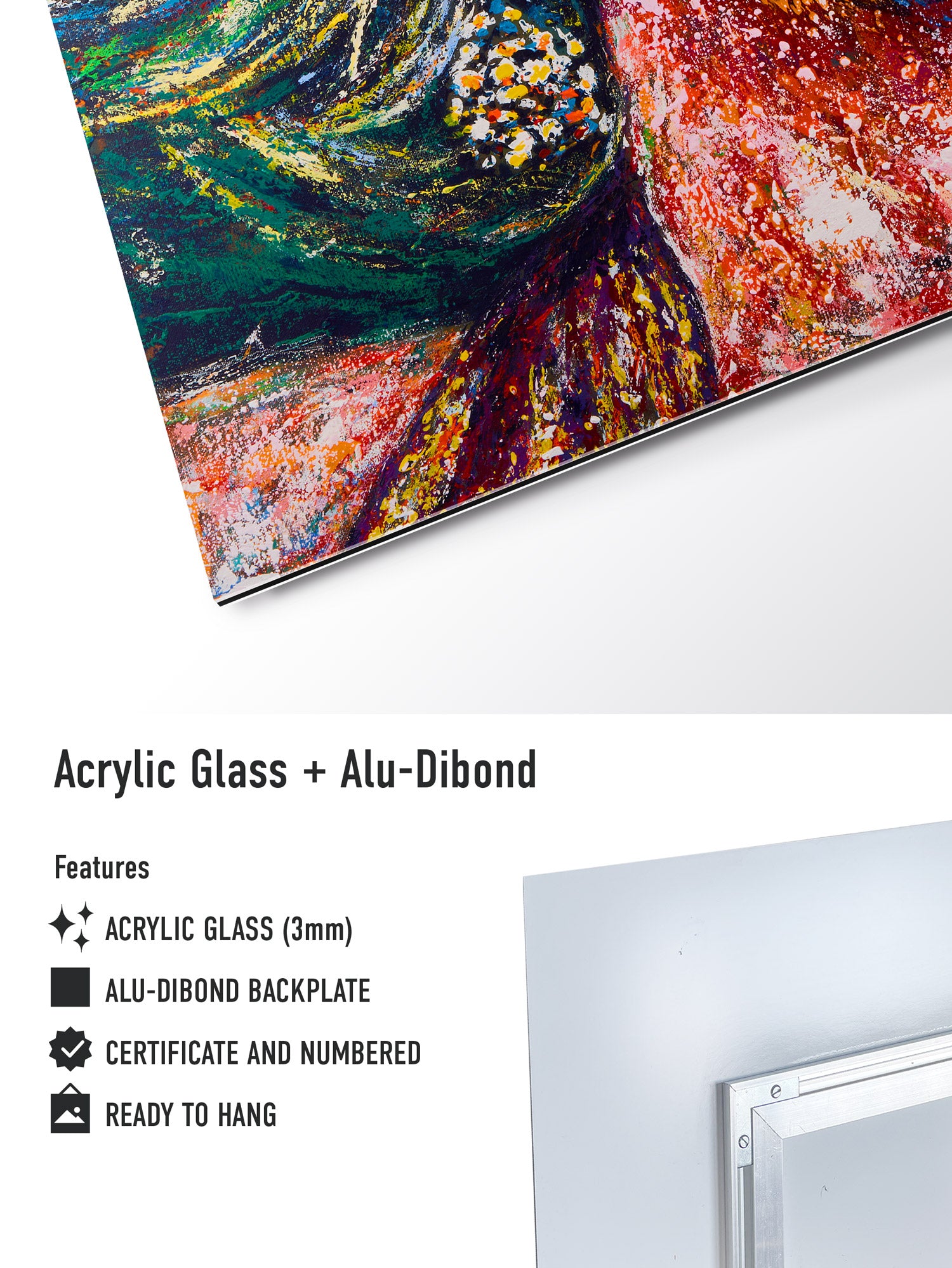 Der Acrylglas-Aufbau verleiht dem Kunstwerk eine beeindruckende Brillanz und Tiefenwirkung. In Verbindung mit dem stabilen 3 mm Alu-Dibond-Trägermaterial entsteht ein außergewöhnlich hochwertiges, langlebiges Kunstobjekt in Galeriequalität.