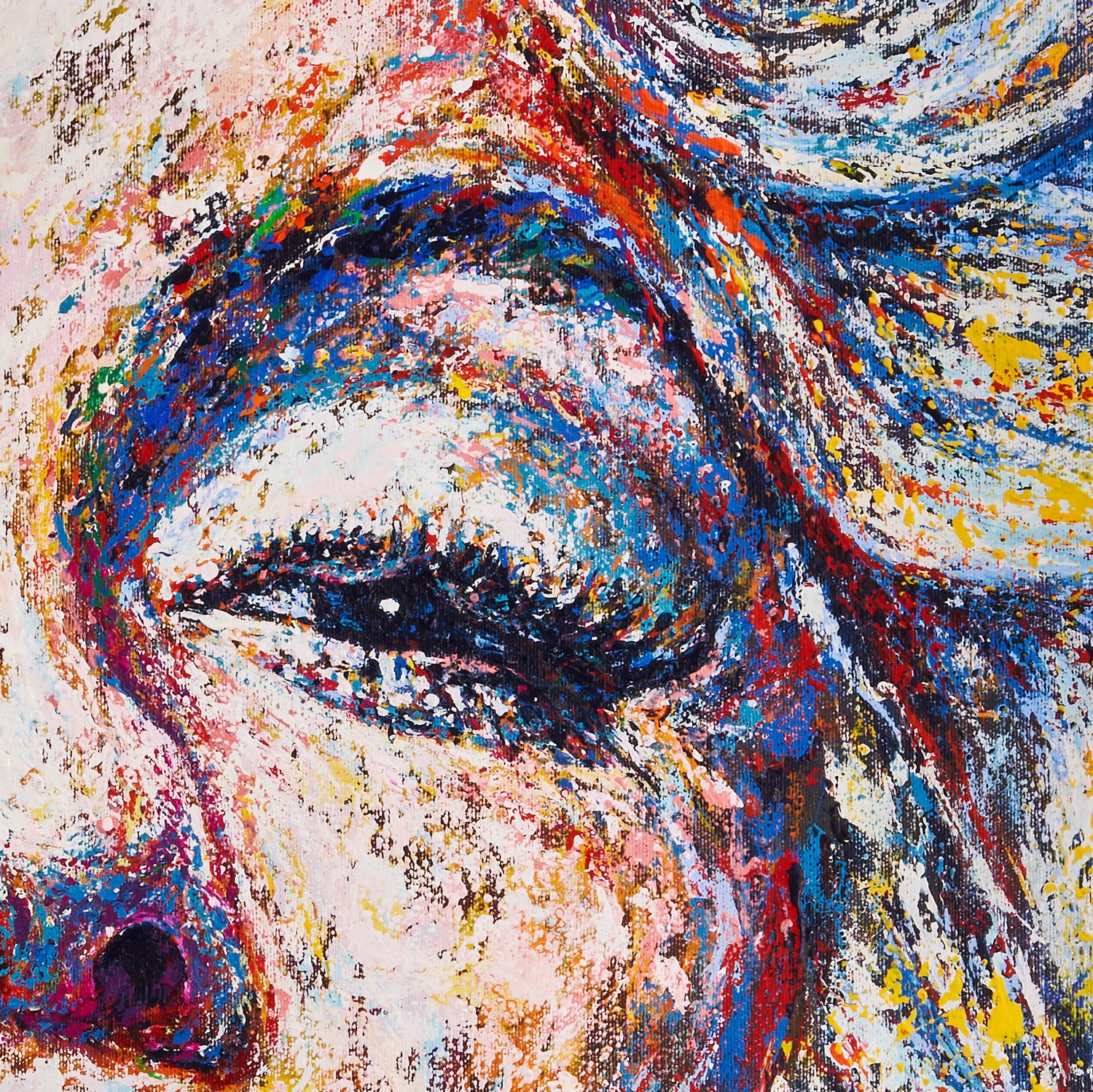 Die charakteristische Spachteltechnik bringt Bewegung und Tiefe in das Gesicht der Ikone, während Licht und Farbe zu Symbolen ihrer inneren Widersprüche werden: Sehnsucht, Stolz, Verletzlichkeit, Mut.