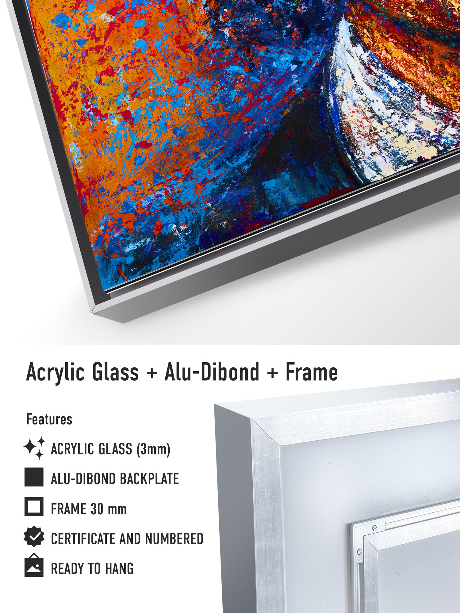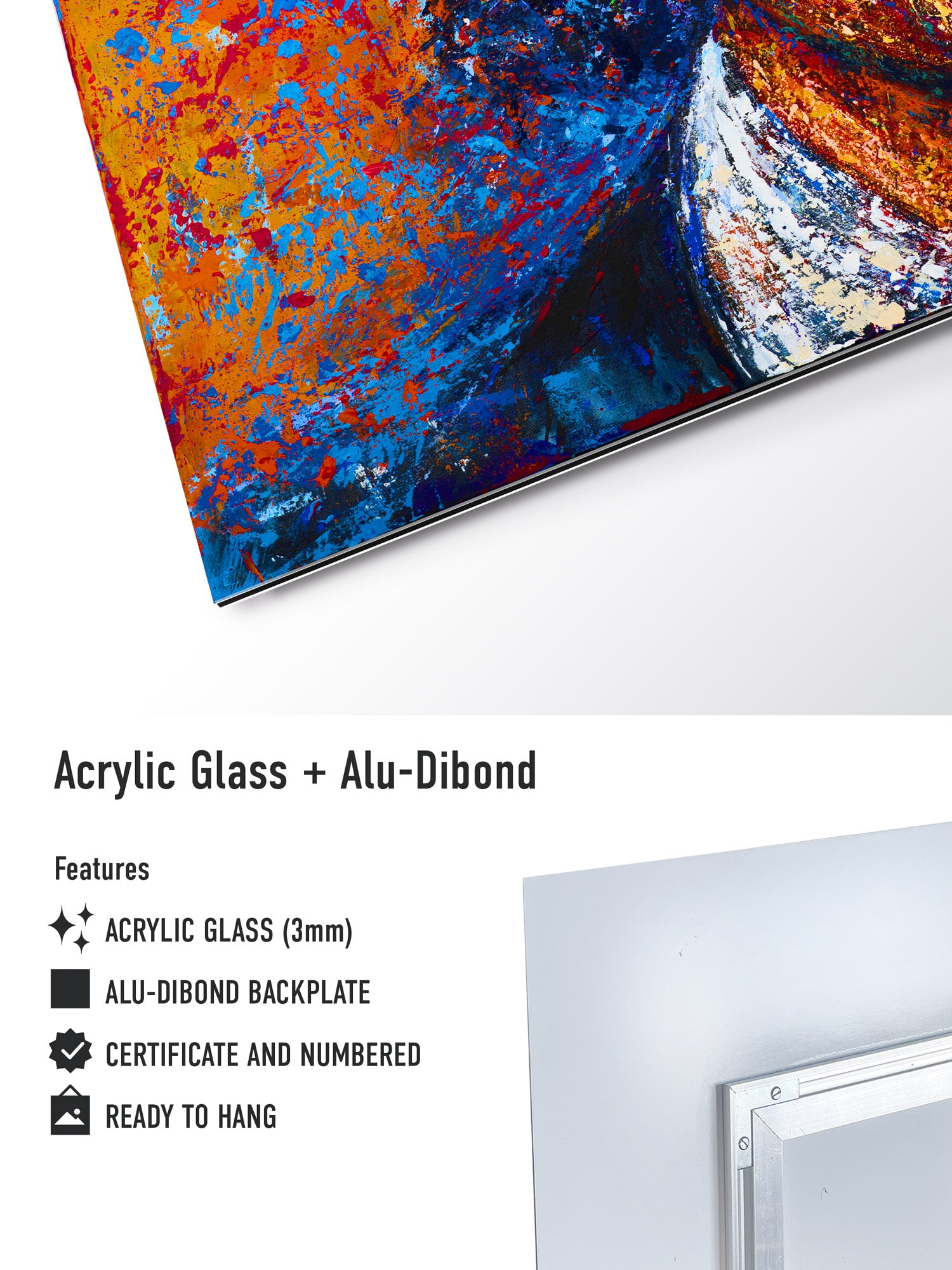 Der Acrylglas-Aufbau verleiht dem Kunstwerk eine beeindruckende Brillanz und Tiefenwirkung. In Verbindung mit dem stabilen 3 mm Alu-Dibond-Trägermaterial entsteht ein außergewöhnlich hochwertiges, langlebiges Kunstobjekt in Galeriequalität.