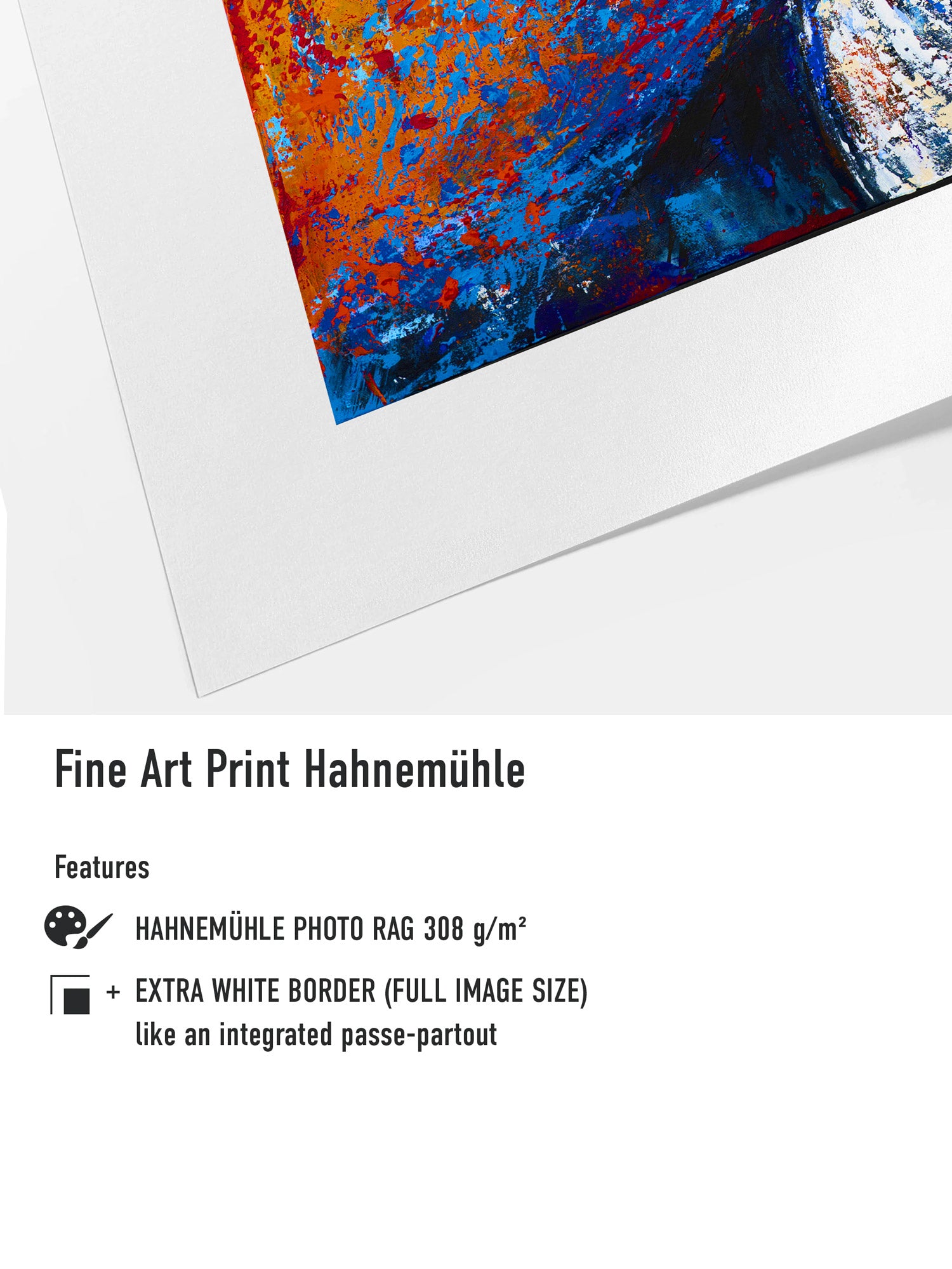 Unsere Fine Art Prints werden auf Hahnemühle Photo Rag in echter Museumsqualität produziert und erhalten einen umlaufenden, exklusiven Weißrand von 5 cm, 8 cm oder 12 cm – abhängig vom gewählten Format. Dieser hochwertige Rand ist mehr als ein ästhetisches Detail: Er macht Ihre Kunstdrucke vielseitiger, eleganter und professioneller.
