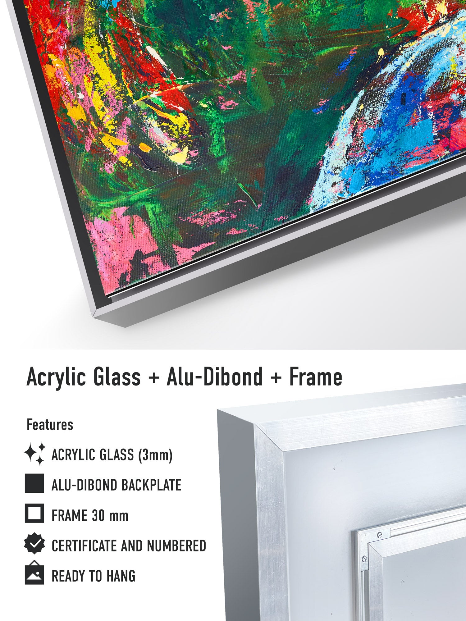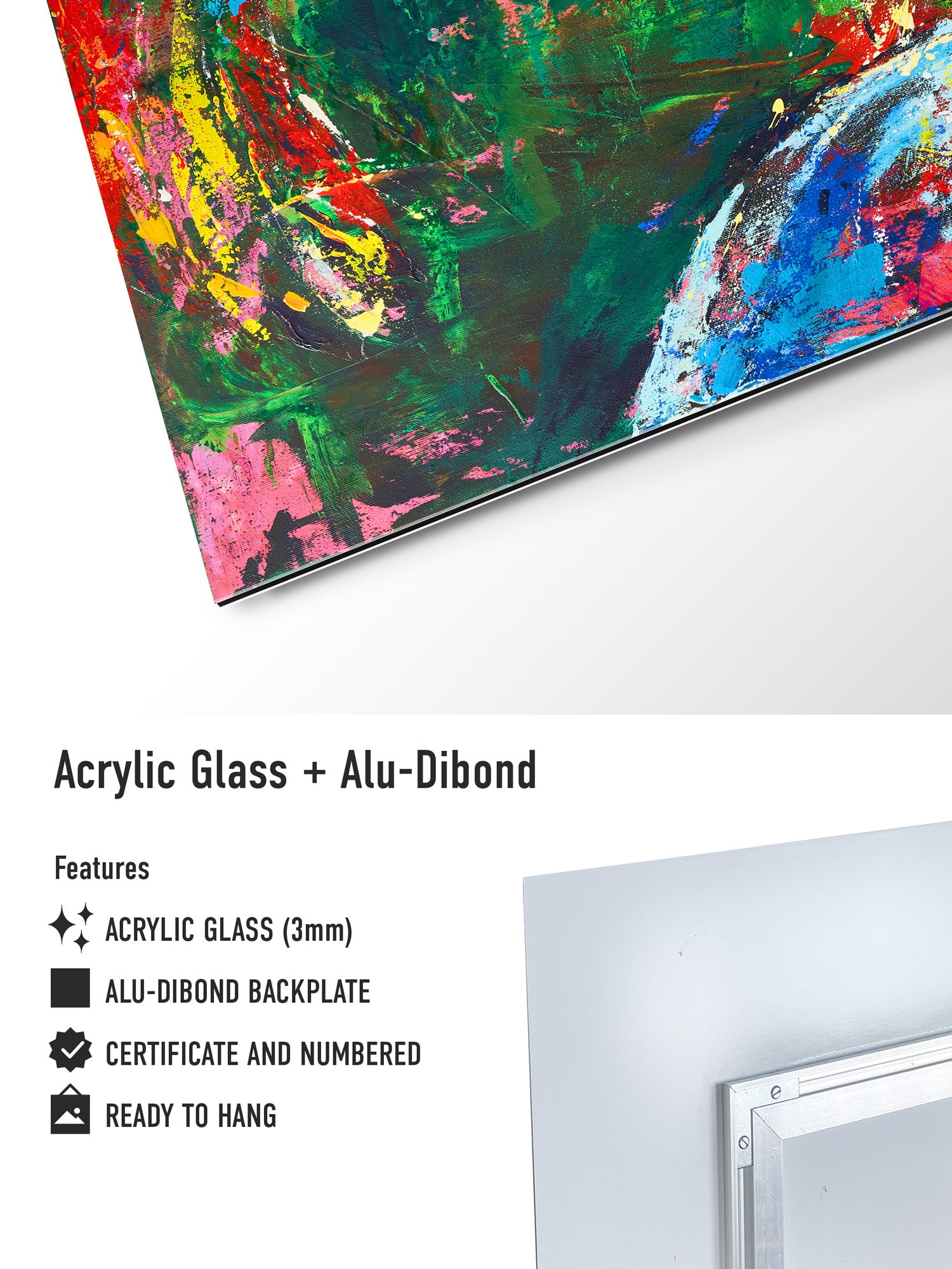 Der Acrylglas-Aufbau verleiht dem Kunstwerk eine beeindruckende Brillanz und Tiefenwirkung. In Verbindung mit dem stabilen 3 mm Alu-Dibond-Trägermaterial entsteht ein außergewöhnlich hochwertiges, langlebiges Kunstobjekt in Galeriequalität.