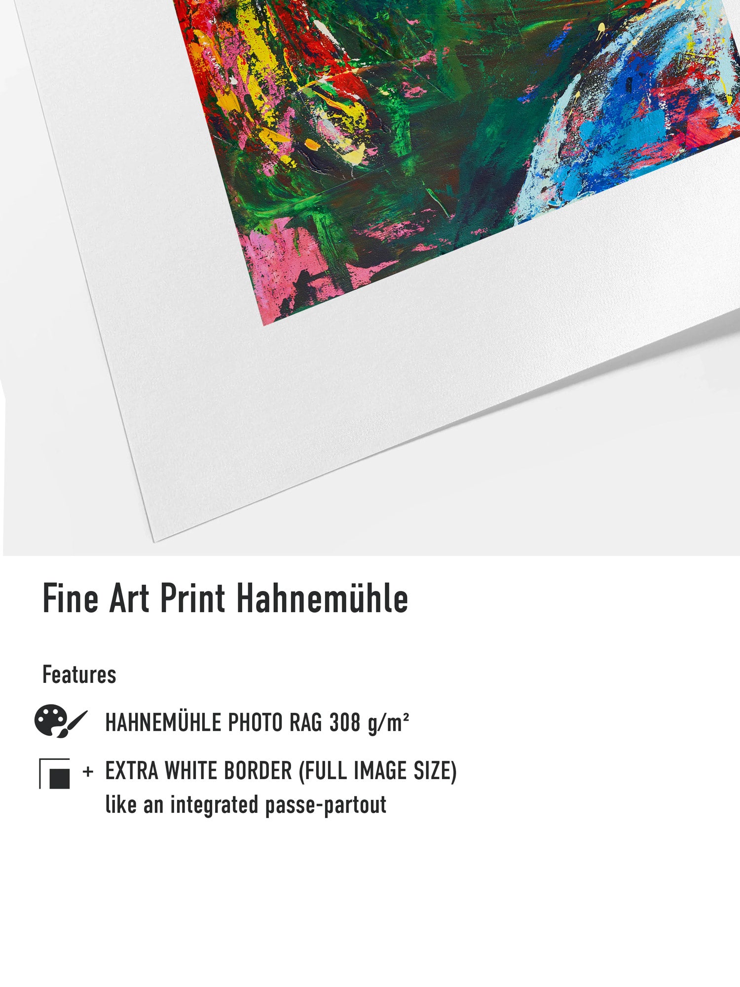 Unsere Fine Art Prints werden auf Hahnemühle Photo Rag in echter Museumsqualität produziert und erhalten einen umlaufenden, exklusiven Weißrand von 5 cm, 8 cm oder 12 cm – abhängig vom gewählten Format. Dieser hochwertige Rand ist mehr als ein ästhetisches Detail: Er macht Ihre Kunstdrucke vielseitiger, eleganter und professioneller.